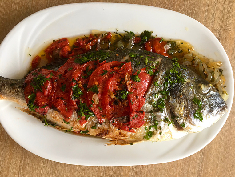 Dorada la tigaie cu cartofi si salsa verde cu masline