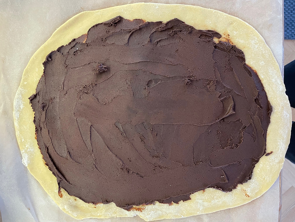 - Ungeti foaia cu jumatate din crema de ciocolata lasand marginile libere cam 2 cm. Intindeti crema cat puteti de uniform (am folosit un cutit de masa).