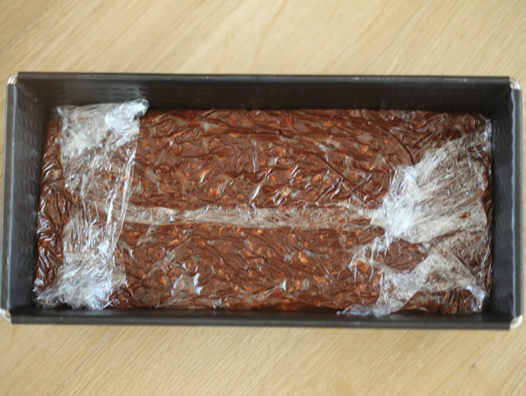 - Ungeti o tava de chec cu un strop de ulei si tapetati-o cu folie de plastic. Turnati amestecul in tava, nivelati. Trageti marginile foliei deasupra si mai nivelati cu mana.