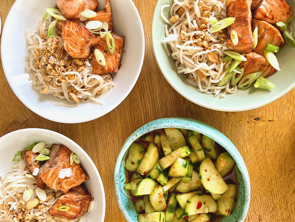 Cum se prepara bol cu somon, castraveti marinati si taietei de orez cu arahide