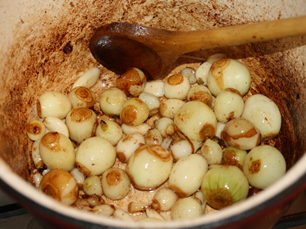 - Cand terminati de prajit toata carnea, adaugati ceapa curatata dar lasata intreaga. Prajiti, amestecand des, pana se rumeneste si incepe sa miroasa dulceag. Adaugati cateii de usturoi curatati, dar lasati intregi. Continuati sa prajiti inca 2 minute. Scoateti ceapa si usturoiul peste carne.