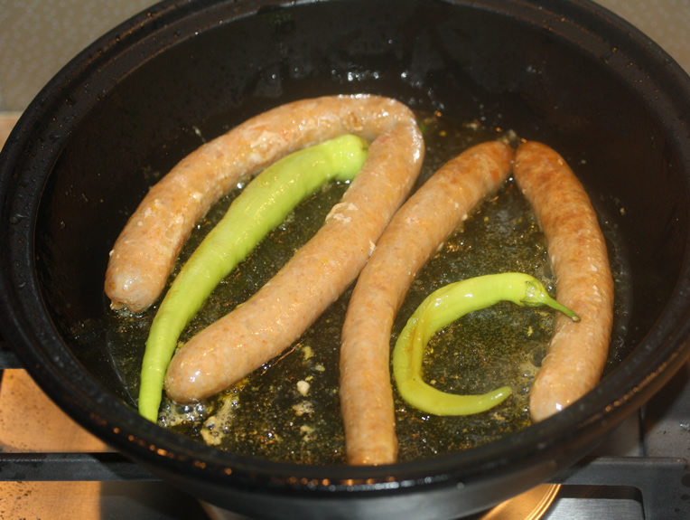 - Se incinge uleiul intr-o cratita mai larga. Se prajesc carnatii pe ambele parti pana se rumenesc un pic. Printre ei se pun ardeii bulgaresti. Se scot carnatii si ardeii pe o farfurie.