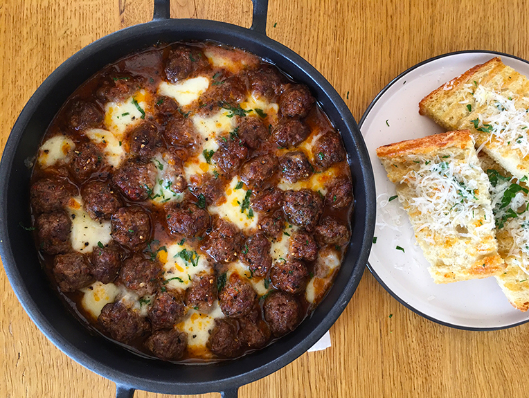 - Turnati continutul tigaii intr-un vas termorezistent de aprox 18-20 cm diametru. Puneti bucati de mozzarella printre chiftelute, pe toata suprafata vasului. Presarati putin patrunjel sau busuioc tocat.