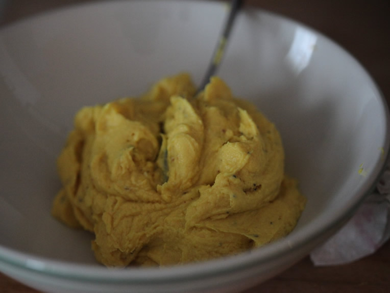- Puneti galbenusurile cu 2 linguri de maioneza (50 gr), mustar, unt, sare, piper negru, chili (daca doriti) in robot si mixati bine pana obtineti o pasta fina. Daca nu aveti robot, doar amestecati manual toate ingredientele. Gustati pasta obtinuta si vedeti daca mai trebuie sare sau mustar. Crema trebuie sa fie putin picanta de la mustar si bine asezoanata cu sare, piper si chili daca va place.