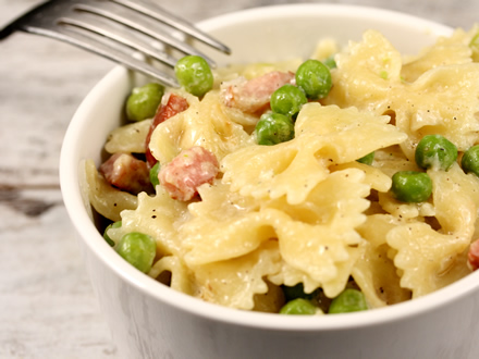 - Se amesteca 100 ml din apa in care fierb pastele cu smantana si se toarna peste costita. Se aduce la fierbere. In acel moment se adauga pastele si mazarea scurse. Se amesteca bine si se condimenteaza cu sare si piper dupa gust.