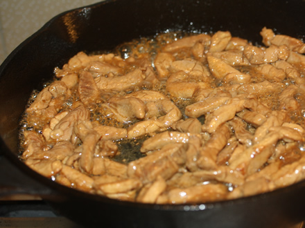 - Intr-un wok (sau tigaie de fonta) se incinge bine 1 lingura de ulei. Se adauga carnea marinata si se soteaza rapid, amestecand mereu, doar pana-si schimba culoarea (cca 1 minut). Se scoate din tigaie cu tot cu sucul lasat.