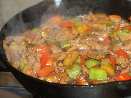 - Adaugati carnea peste legume (cu tot cu sucul lasat) si adaugati amidonul dizolvat in apa. Amestecati rapid doar pana se formeaza un sos lucios care acopera legumele si carnea (cca 1-2 minute).