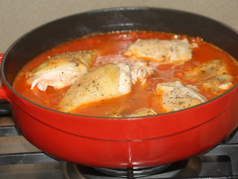 - Se pune puiul inapoi in cratita, se adauga 1 cana de apa (250 ml), sare si piper negru macinat. Se aduce la fierbere. Se fierbe cu capac, la foc mediu spre mic, timp de 30 minute.