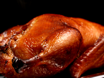 - Umplutura: Se amesteca sarea, piperul si ghimbirul si se freaca rata DOAR in interior cu acesta amestec. Se introduce in cavitate ceapa taiata felii, usturoiul taiat in doua si sosul de soia si sucul de portocale.