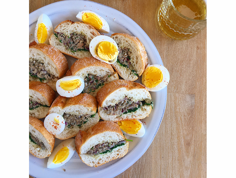 * sandwichul (netaiat) poate fi pastrat la frigider invelit in folie pana la servire - Taiati sandwichul felii cu un cutit mare zimtat (de paine). Serviti cu oua fierte.