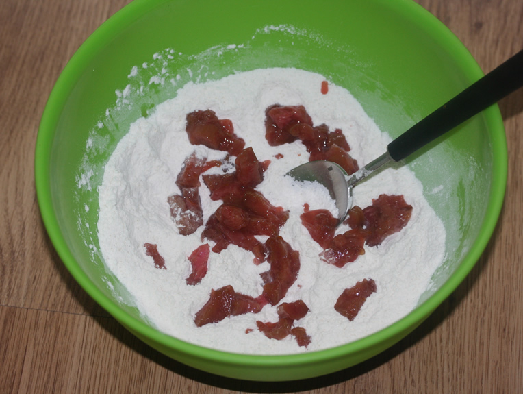 - Se amesteca faina cu zaharul, praful de copt?si sarea. Se adauga in faina bucatile de rubarba (incercati sa luati cat mai putin sirop; daca bucatile sunt mai mari le puteti toca inainte cu un cutit). Cu mana aduceti faina peste bucatile de rubarba si apoi rasfirati faina si rubarba cu degetele astfel incat rubarba sa se distribuie uniform si siropul ei sa fie absorbita in faina.