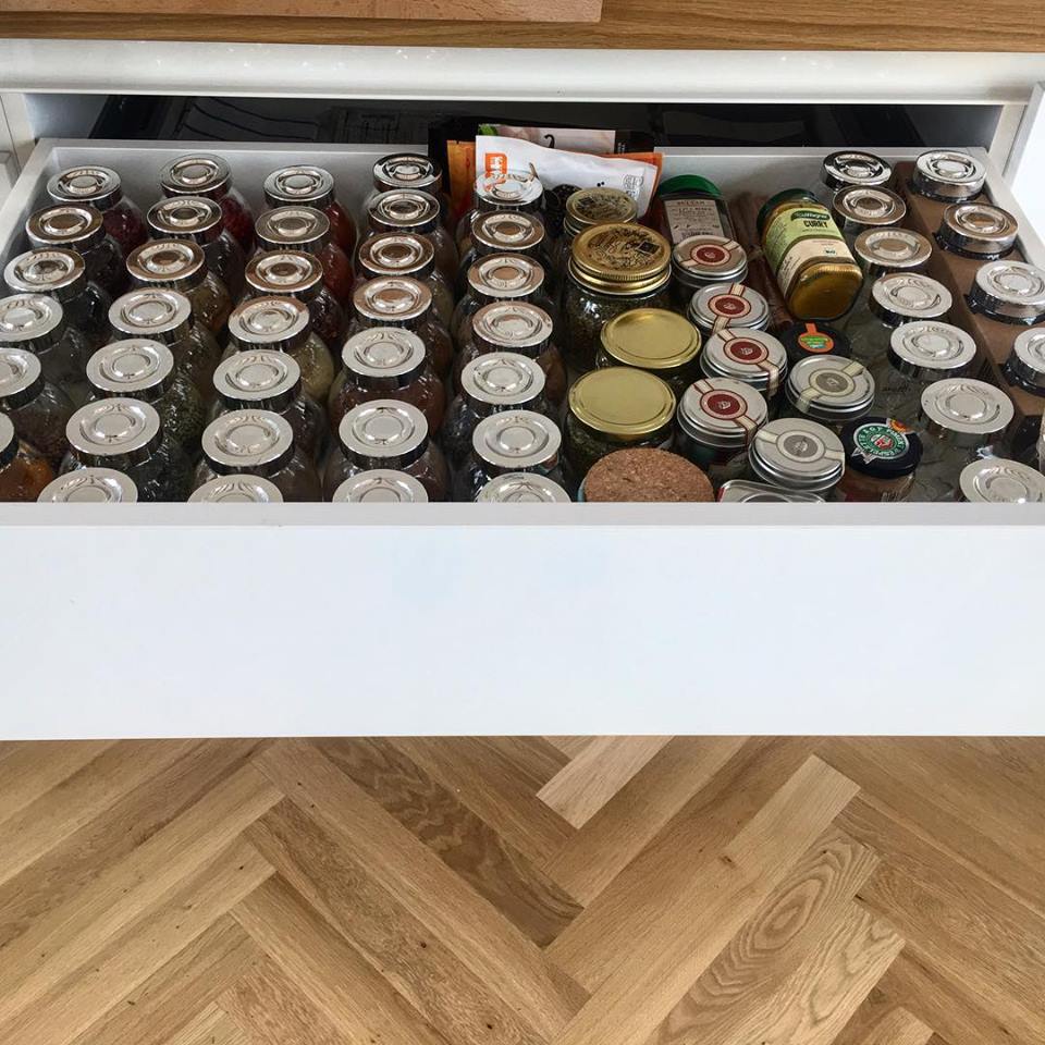 Cele mai importante condimente le am la indemana. Le-am organizat in primul sertar de sub zona de lucru. Borcanele sunt de la Ikea.