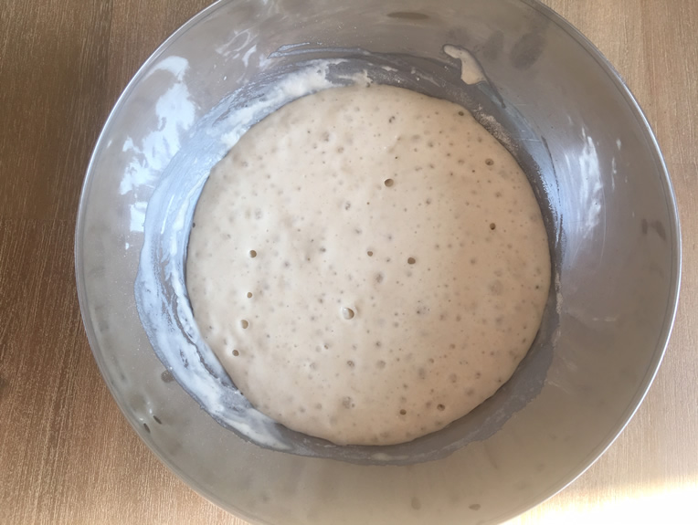 - Dupa 4 ore se adauga peste aceasta maia restul de faina amestecata cu restul de drojdie, restul de apa in care s-a dizolvat sarea. Se framanta bine pana aveti un aluat elastic (sau 5 minute cu robotul; sau o tura in masina de paine). Va rezulta un aluat foarte elastic si usor lipicios.