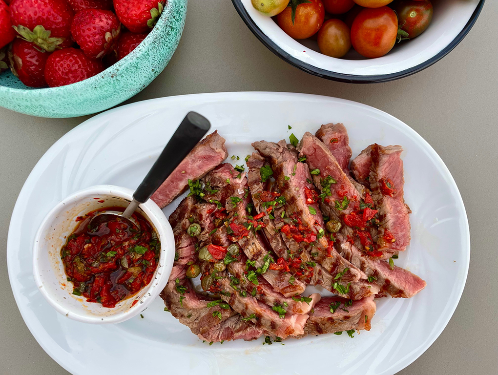Cand aveti mai putine bucati de steak decat persoane la masa, tagliata rezolva elegant problema. Sambata am gasit doar o singura bucata de vrabioara, era ultima din magazin, si asa transformat-o in cina pentru 2 persoane. Am gatit-o simplu, la gratar (fara marinata) fiindca era o bucata calitativa iar salsa asta e deosebita (inspirata din celebrul sos de paste puttanesca, doar ca baza e de ardei iuti in loc de rosii) asa ca am vrut sa se simta gustul amandurora.