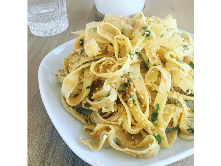 - Luati cate doua omlete, le rulati pe blatul de lucru si apoi le taiati rondele subtiri. Dupa ce ati taiat toate omletele, rasfirati rondelele si le asezati intr-un bol.