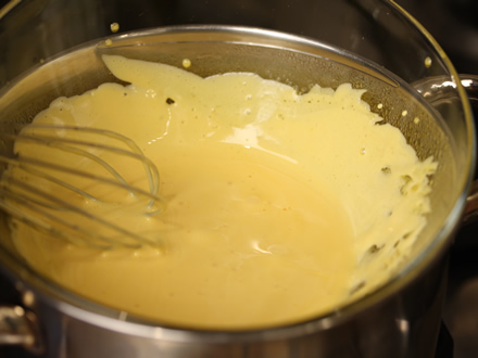 - Crema de oua: intr-un vas punem galbenusurile oualor, zaharul tos si romul. Il asezam pe o oala cu apa care fierbe incet si cu un tel batem bine amestecul pe abur, pana zaharul e complet topit. Va dura cam 8-10 minute daca faceti operatia manual. Puteti insa sa folositi si un mixer. Cand zaharul e complet topit (treceti cu degetul pe fundul craticioarei si simtiti daca mai sunt granule netopite de zahar), luati craticioara de pe abur si puneti-o cu fundul intr-un vas in care ati pus apa rece gheata. Continuati sa amestecti cu telul pana crema de oua e racita, cam 3-4 minute. Veti simti cum crema se ingroasa si la final va curge de pe tel in fir gros. Verificati crema cu degetul si cand o simtiti la temp. camerei e gata.