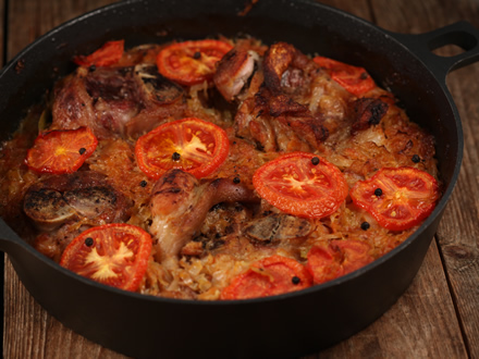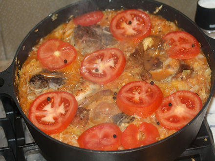 - Adaugati foile de dafin rupte in 2-3 bucati, frunzulitele de cimbru tocate si amestecati bine. Asezati carnea printre varza. Asezati felii de rosii deasupra si presarati cateva boabe de piper.